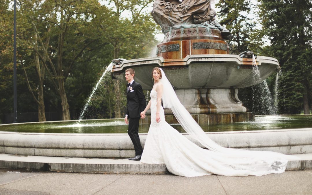 newlyweds walking by pittsburgh, pa fountain